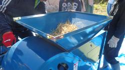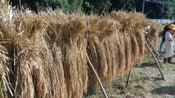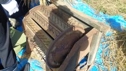 秋晴れの爽やかな日差しを受け、地域の方から提供していただいた千歯扱ぎを使い脱穀を行いました。