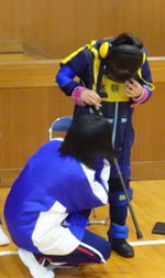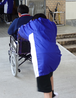 高齢者福祉体験を行いました。特に車いすの扱い方では、介護する方と車いすに乗る方での感じ方の違いを実感しました。