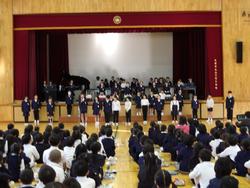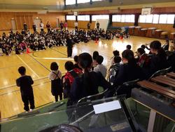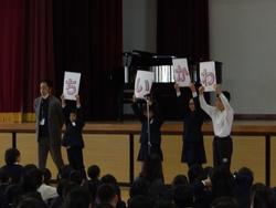 下校会の時、新しい先生たちに児童会の代表が歓迎の挨拶をしました。