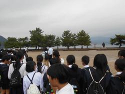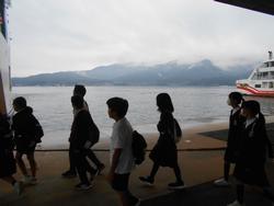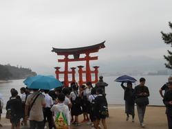 2日目も雨のスタートとなりました。早朝にホテルを出発し、バスで宮島へと向かいました。
