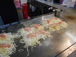 目の前でお店の方が焼いてくれた、あつあつの肉玉そば入りお好み焼きをおいしくいただきました。