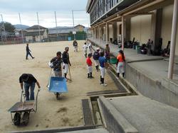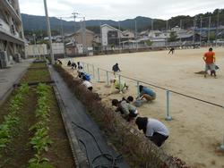 早朝より、PTA役員の皆様と教職員で、運動場やその周辺の草引きや溝掃除などを中心に環境整備作業を行いました。