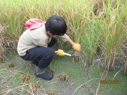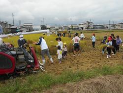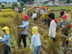 5年生の子どもたちは、田植えの時と同様に幼稚園の子どもたちの手を取り、優しくサポートしながらいっしょにいねかりの作業を行ってくれました。