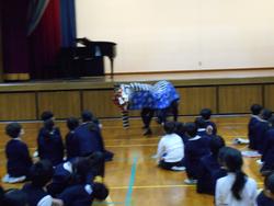1月7日の始業式の日には、毎年恒例の獅子舞が柳本小学校にやってきました。