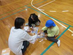 まず、体育館でかるたやコマまわし、福笑いなどのむかしから伝わる遊びを楽しみました。